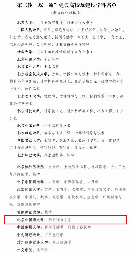 四、北外入选第二轮“双一流”建设高校及建设学科名单