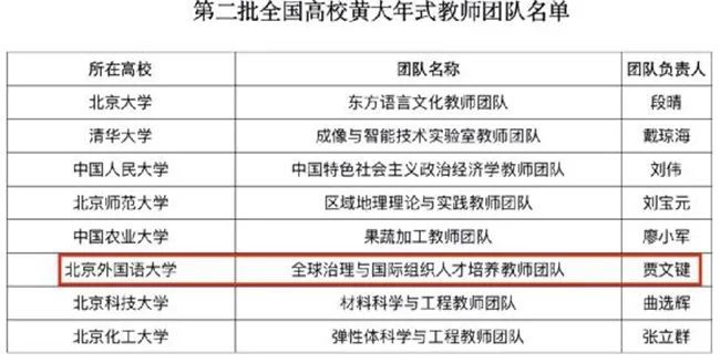 2022年1月,教育部印发《关于公布第二批全国高校黄大年式教师团队的通知》,全国共计200个教师团队获批。北外“全球治理与国际组织人才培养教师团队”入选,是北外继“中国外语与教育研究中心教师团队”入选后再获“全国高校黄大年式教师团队”殊荣的团队。