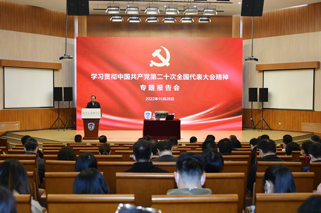 党委理论学习中心组专题学习党的二十大精神,深入研究贯彻落实举措,精心制定工作方案,提出六个方面、十六项具体举措。各基层党组织灵活创新学习形式,持续提升学习实效。学校通过各类媒体平台大力宣传党的二十大精神,建设专题网站,策划优质网络内容,形成强大正面舆论;成立宣讲团,开展对象化、分众化、互动化宣讲;设立专项课题,深入开展研究阐释,着力推动“大思政课”建设,把党的二十大精神融入教育教学全过程;发挥多语种优势,助力党的二十大精神全球传播。全校上下凝聚思想共识、激发奋进力量,对标对表党的二十大提出的一系列新目标、新任务、新要求,推动学校平稳较快高质量发展。