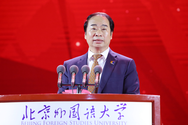 教育部党组成员、副部长钟登华,北京市委教育工委常务副书记郑吉春,全国人大外事委员会主任委员张业遂,外交部原部长李肇星,全国政协港澳台侨委员会副主任裘援平,中国人民武装警察部队中将、副政委陈剑飞,北京大学校长郝平,北京理工大学校长张军,中国原常驻日内瓦代表团代表、联合国原副秘书长金永健,中国人民对外友好协会原会长陈昊苏,中国原驻英国大使马振岗,第十届全国政协港澳台侨委员会副主任唐闻生,中国原驻欧盟使团长、大使关呈远,中国原驻法国大使赵进军,海南省原副省长、原国家工商总局副局长李东生,总参谋部二部原副部长、少将张志凯,海军原副参谋长、少将周伯荣,中国政府欧亚地区事务特别代表、外交部原副部长李辉,新华社原副社长马胜荣,中国延安精神研究会常务副会长、中联部原副部长艾平,中国原驻印度大使张炎,中国政府拉美事务特别代表、中国原驻墨西哥大使邱小琪,第十二届全国人大法律委员会副主任委员李连宁,中国外文局副局长、总编辑高岸明,中国银行总行副行长陈怀宇,中央社会主义学院党组成员、教务长徐绍钢,北京冬奥组委对外联络部副部长万学军等出席大会,外交部、商务部、安全部等相关部委司局领导,空军装备部、北京市外办、山西省教工委、新华社、中央广播电视总台、中国对外文化集团、人民网、中国日报、凤凰卫视、环球时报、中国交通建设集团等单位代表,阿尔巴尼亚、亚美尼亚等30多个国家的驻华使节,兄弟高校代表,生源中学代表,学校老领导、离退休人员、校友和师生代表参加大会。全校师生、海内外校友和社会各界人士通过线上直播方式“云端”相聚。大会由北外党委书记王定华主持,党委副书记、校长杨丹作了题为“语通中外,道济天下”的致辞。