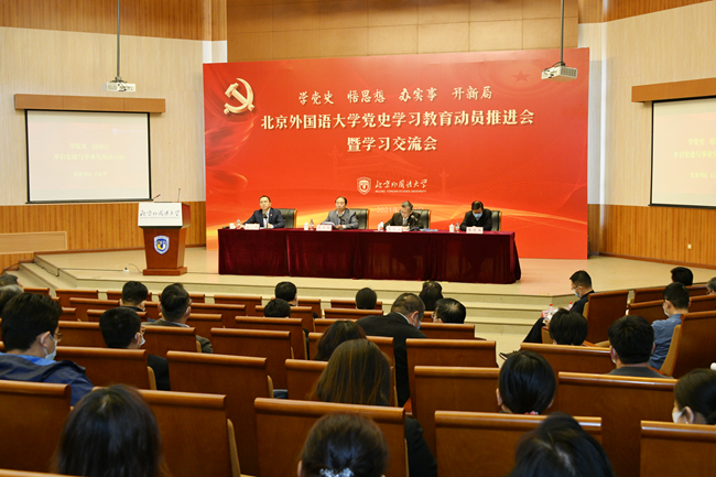 党史学习教育是“必修课”。学习党史是我们坚持和发展中国特色社会主义、把党和国家各项事业继续推向前进的必修课,这门功课不仅必修,而且必须修好。开展党史学习教育,就是以史为镜,用党的奋斗历程和伟大成就鼓舞斗志、明确方向;就是以史鉴今,用党的光荣传统和优良作风坚定信念、凝聚力量;就是以史明智,用党的实践创造和历史经验启迪智慧、砥砺品格。党史学习教育是“教科书”。党的百年非凡奋斗历程,蕴含着最好的精神营养。高校立身之本在于立德树人,要坚持以百年党史铸魂补钙、涵养精神,将学史明理、学史增信、学史崇德、学史力行贯通起来,教育引导师生明理以悟道、增信以强志、崇德以修身、力行以报国,坚定不移听党话、跟党走。党史学习教育是“动力源”。要聚焦教育系统党史学习教育的重点内容,悟创新理论伟力,强“两个维护”自觉,守立德树人初心,开教育发展新局。坚持不懈用习近平新时代中国特色社会主义思想武装头脑、指导实践、推动工作,传承红色基因,加强党的领导,落实立德树人根本任务,持续提升学校党建和思想政治工作质量和水平,为建设国际化、重特色、高水平、综合型的世界一流外国语大学而不懈努力。