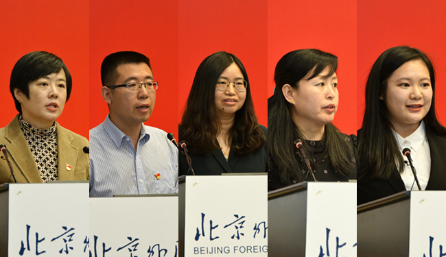 会上,“双带头人”教师党支部书记、西班牙语葡萄牙语学院张方方,“四史”类选择性必修课教师、马克思主义学院王成诚,俄语学院党总支书记黄玫教授,教师党员代表、国际关系学院教授张颖,学生党员代表、英语学院本科生孙琳分别以“发挥党支部作用、深化教师党史学习教育”“党史必修课教学与实践”“深化党史教育,传承红色基因”“在党史学习中寻求学术创新——开展周恩来研究的感悟”“永远跟党走、青春献祖国”为题做学习交流发言。
