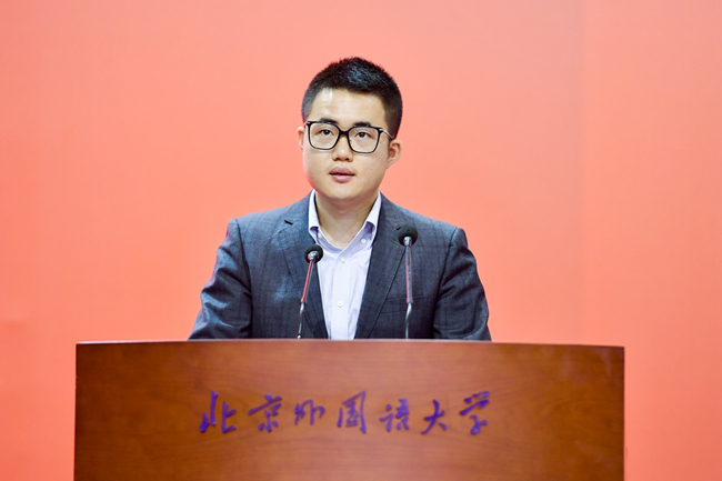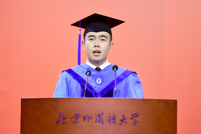 高级翻译学院廖智超作为硕士研究生代表发言。他围绕“路”这一意象,回顾了从家乡启程到北外经历学术上的磨砺,到国际舞台上以翻译为媒介促进中外交流,再到海外学习拓宽国际视野这一路走来的种种,表示在北外的学习激发了自己勇于探索、不断超越的追求。他呼吁同学们积极选择挑战之路,不忘初心,勇担时代使命,为促进全球理解与构建人类命运共同体作出不懈努力。